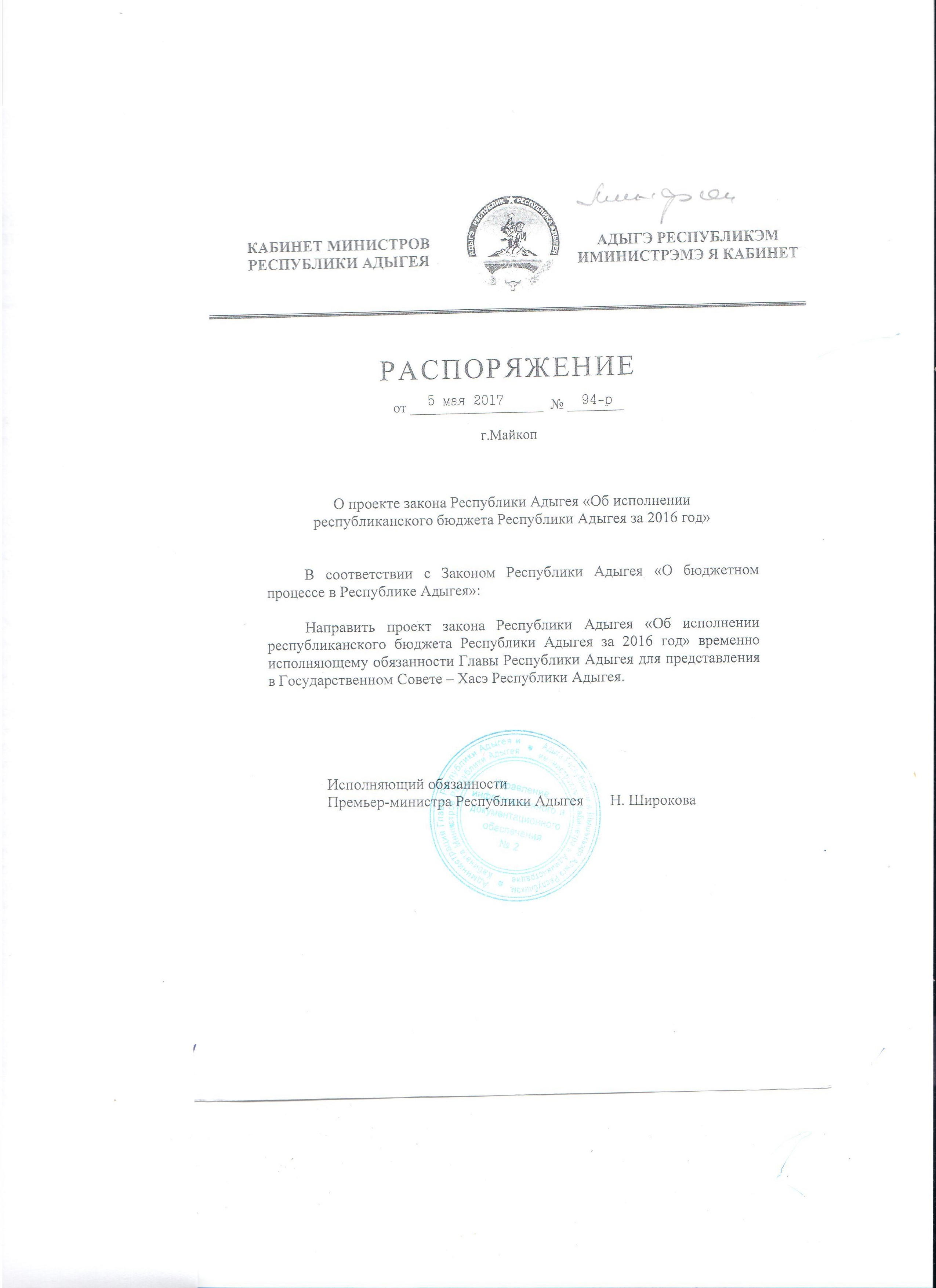 Распоряжение Кабинета Министров Республики Адыгея от 05.05.2017 № 94-р "О проекте закона Республики Адыгея "Об исполнении республиканского бюджета Республики Адыгея за 2016 год"