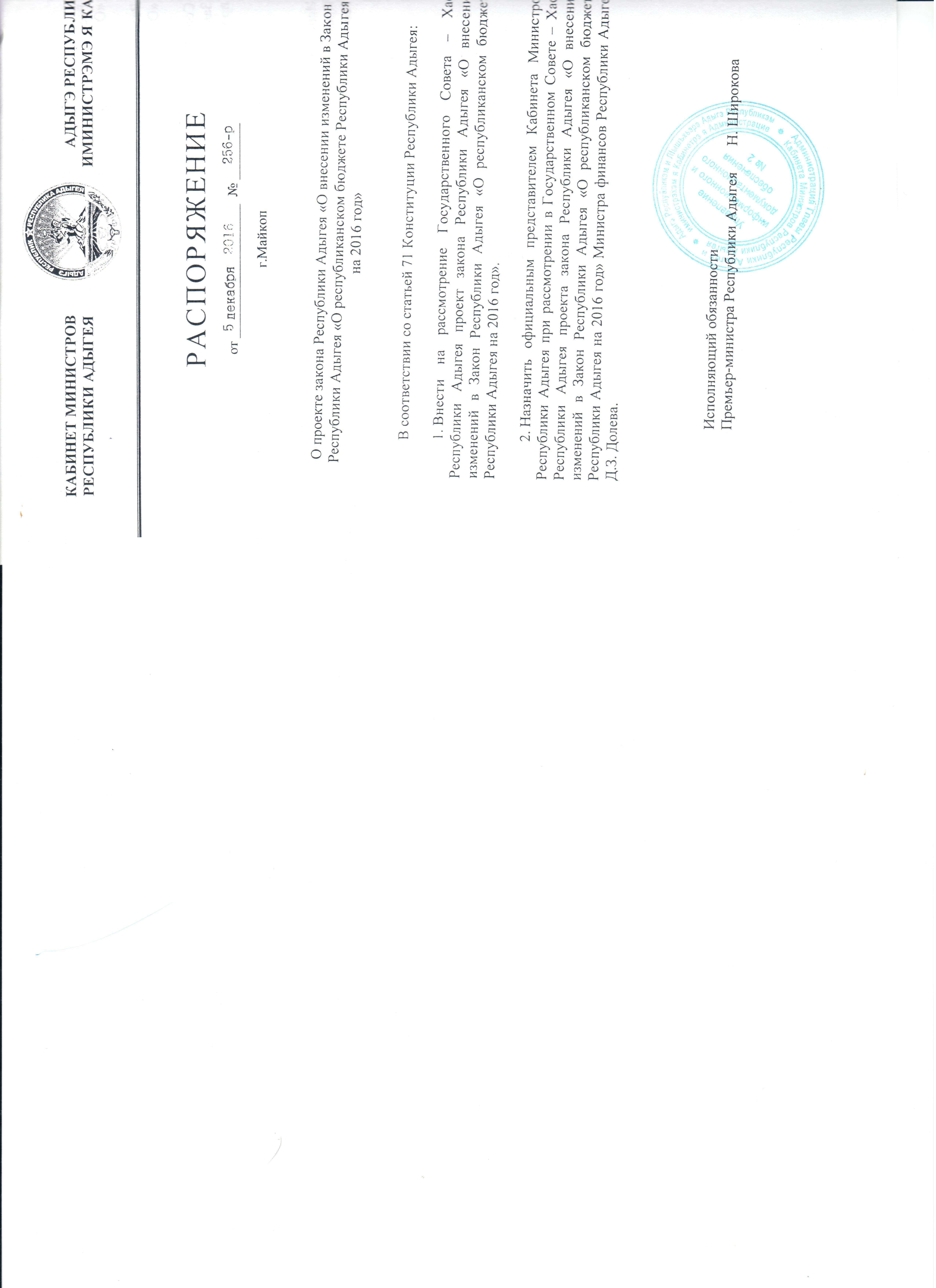 Распоряжение Кабинета Министров Республики Адыгея от 05.12.2016 № 256-р "О проекте закона Республики Адыгея "О внесении изменений в Закон Республики Адыгея "О республиканском бюджете Республики Адыгея на 2016 год"
