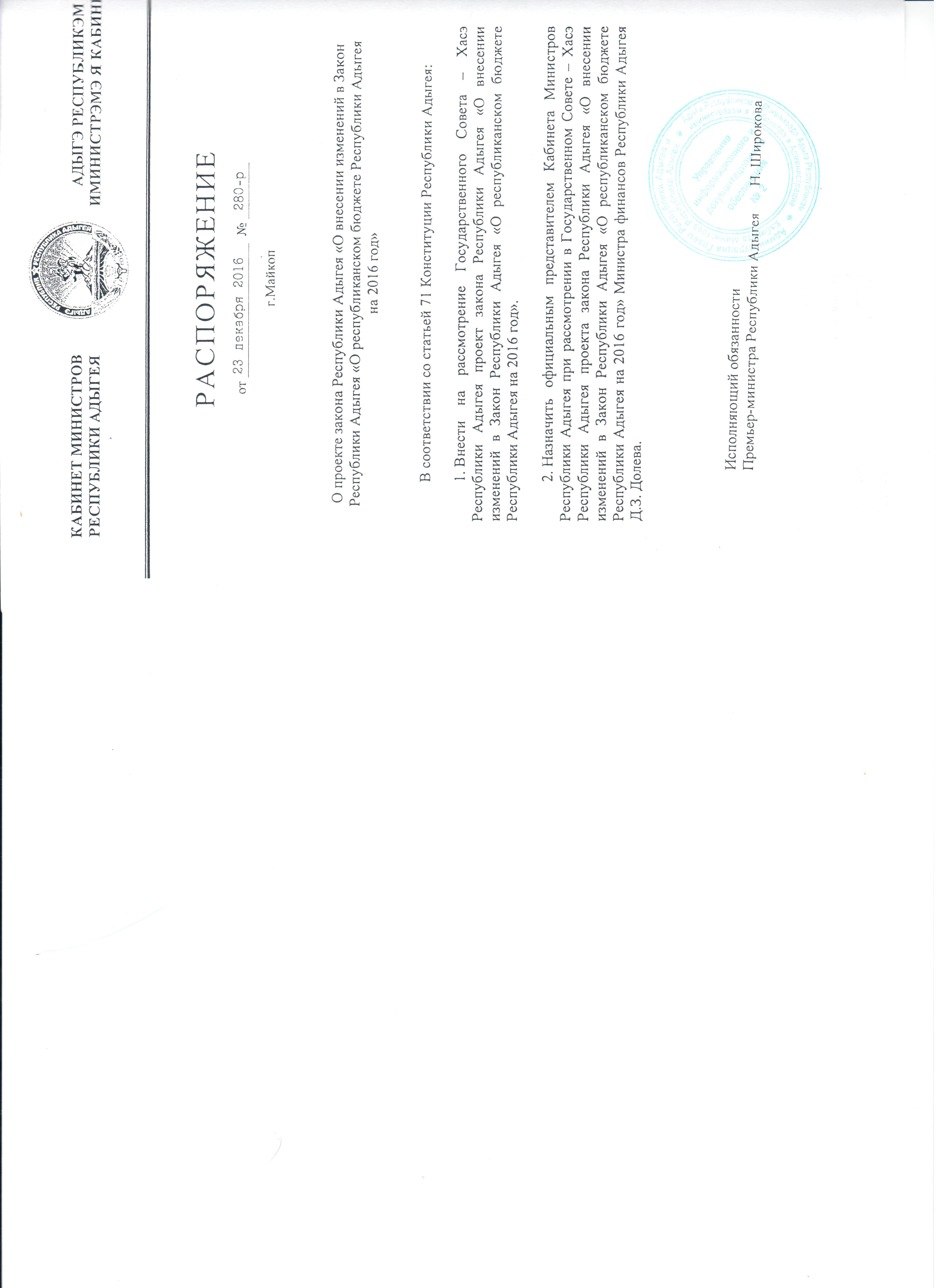 Распоряжение Кабинета Министров Республики Адыгея от 23.12.2016 № 280-р "О проекте закона Республики Адыгея "О внесении изменений в Закон Республики Адыгея "О республиканском бюджете Республики Адыгея на 2016 год"