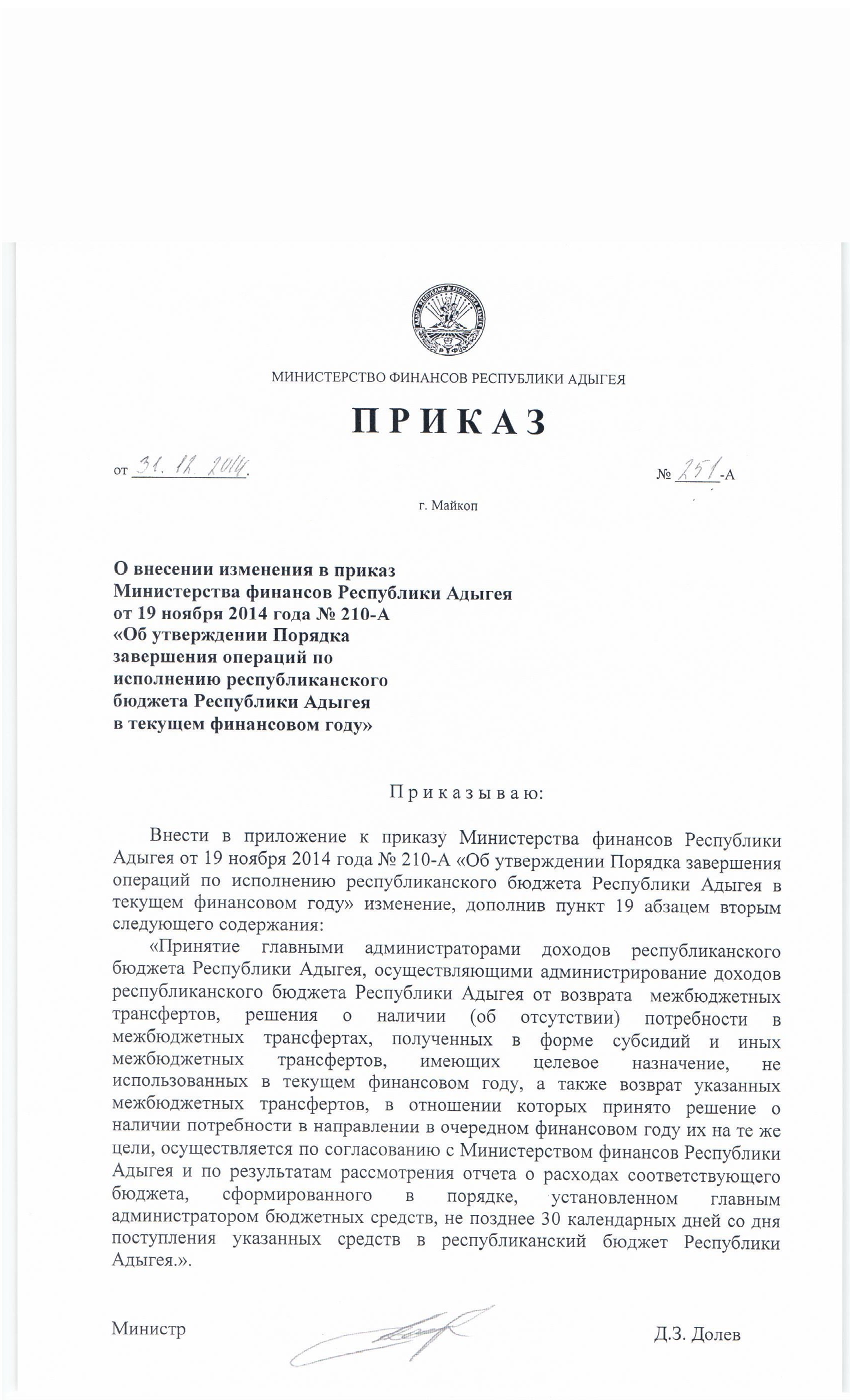 Приказ Министерства финансов Республики Адыгея от 31.12.2014 № 251-А "О внесении изменения в приказ Министерства финансов Республики Адыгея от 19 ноября 2014 года № 210-А "Об утверждении Порядка завершения операций по исполнению республиканского бюджета Республики Адыгея в текущем финансовом году"