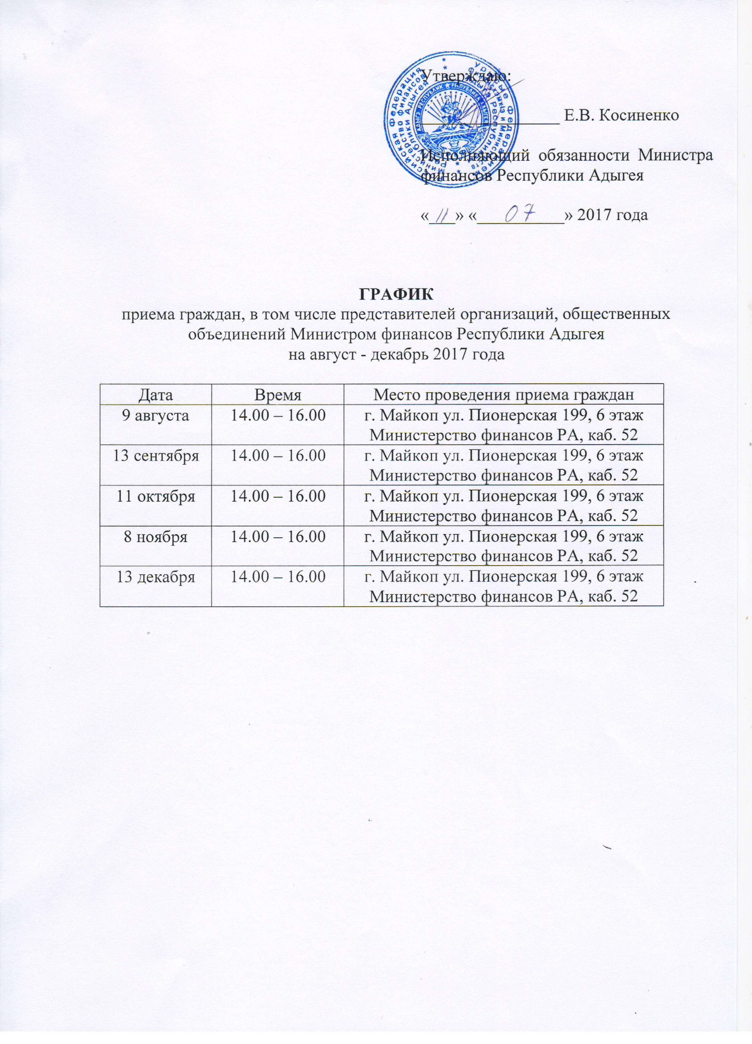 График приема граждан, в том числе представителей организаций, общественных объединений Министром финансов Республики Адыгея на август-декабрь 2017 года
