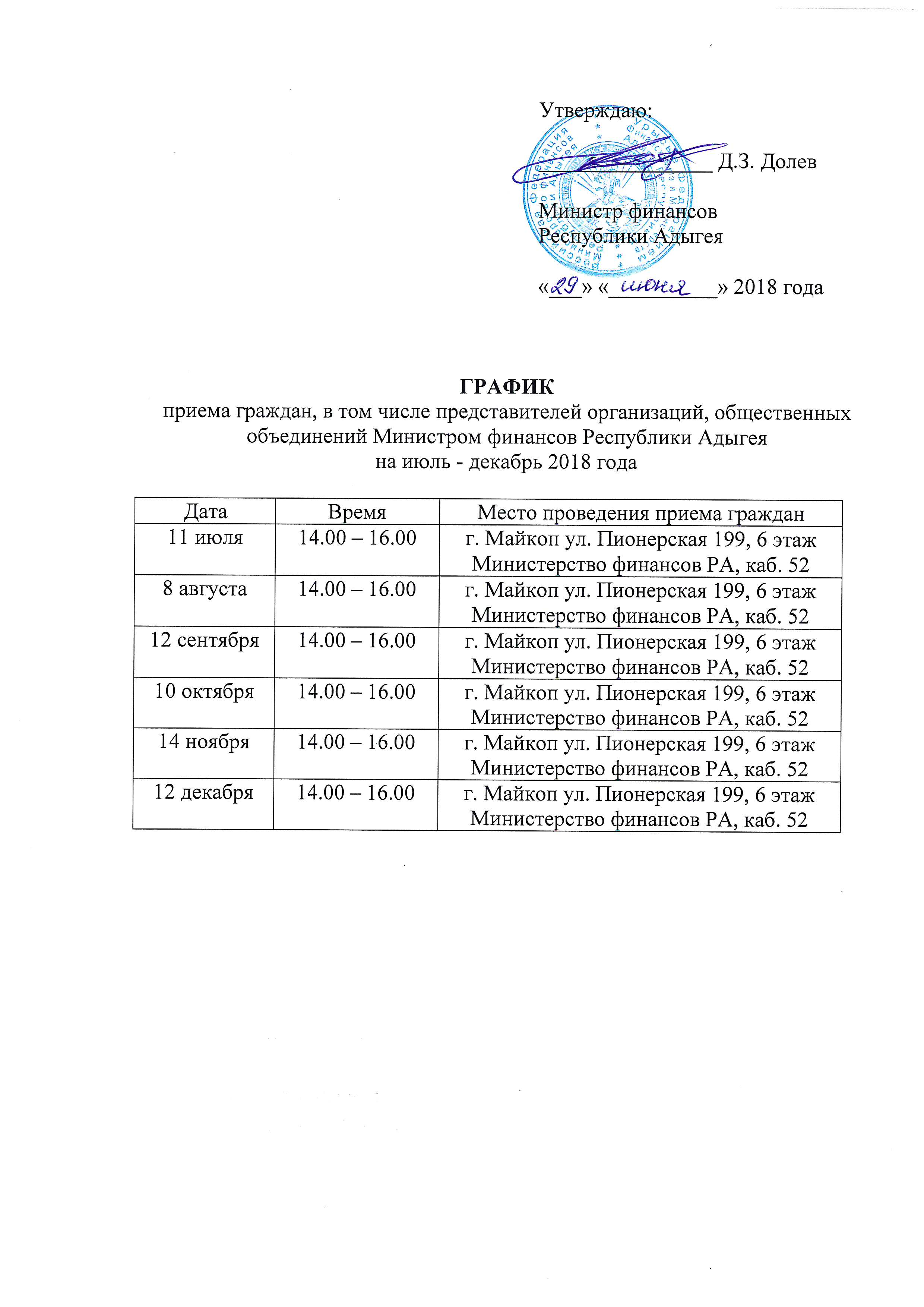 График приема граждан, в том числе представителей организаций, общественных объединений Министром финансов Республики Адыгея на июль - декабрь 2018 года