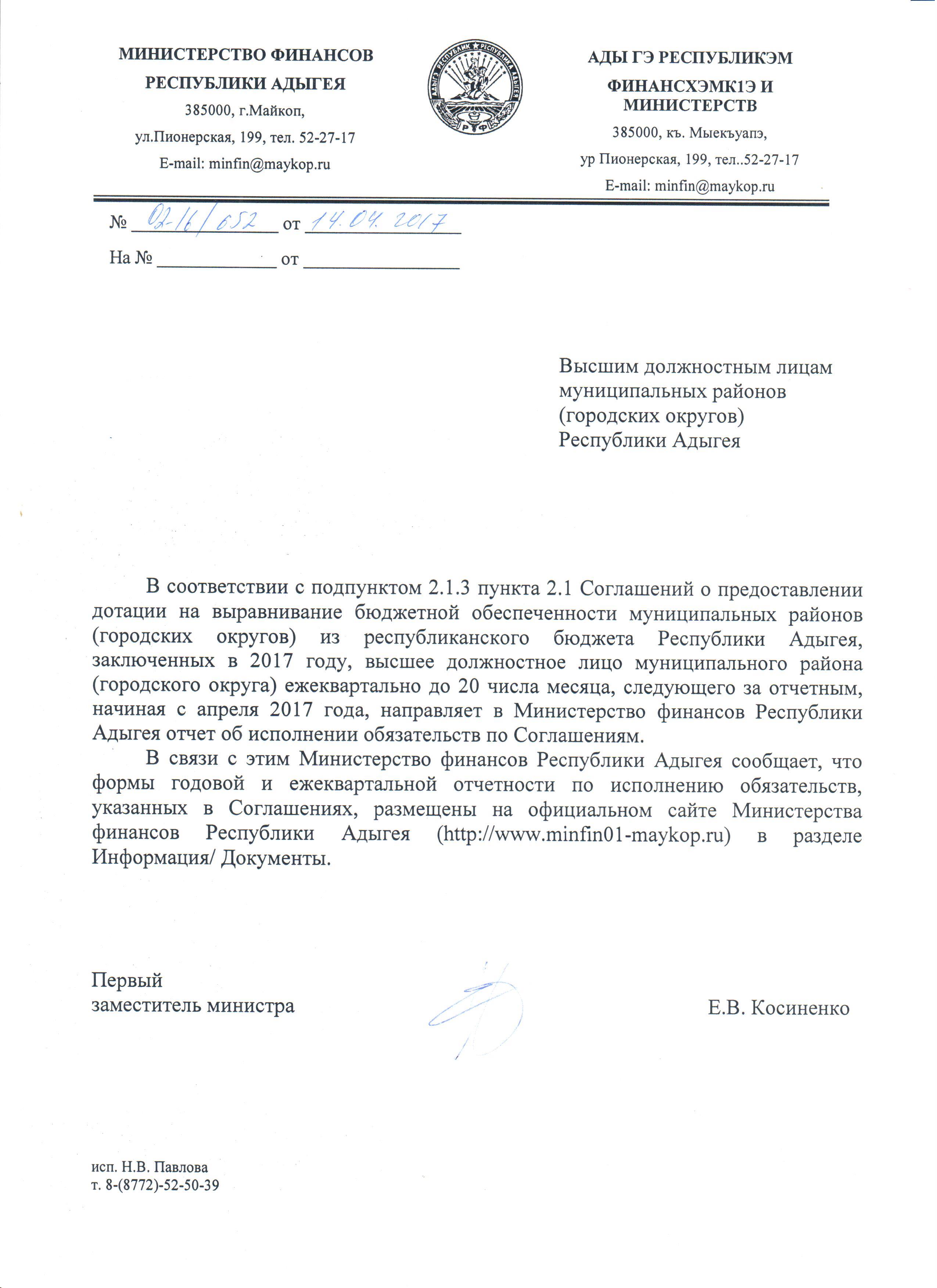 Письмо Министерства финансов Республики Адыгея от 14.04.2017 № 02-16/652